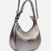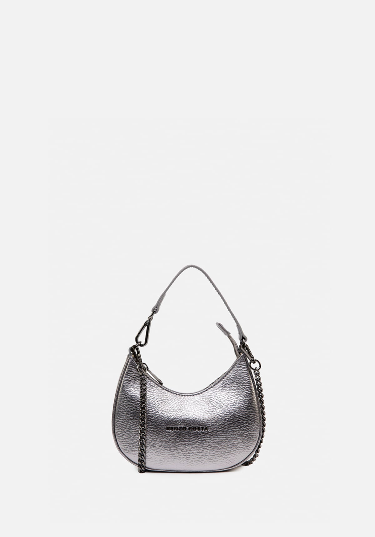 Una silueta que despierta gran obsesión: así es nuestro pouch bag Bell. Confeccionada en cuero grabado de tacto suave, lleva nuestro logo en una versión moderna y minimalista. Disponible en tres tonos metalizados para darle un toque brillante. Llévala a la mano o al hombro, gracias a su cadena extraíble.